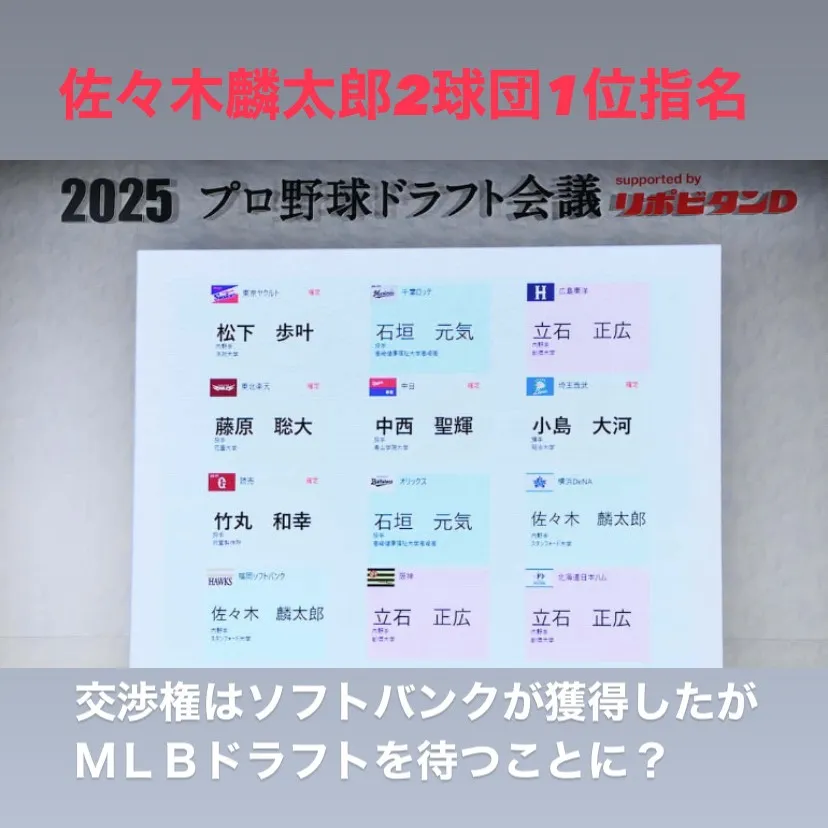 2025年のプロ野球ドラフト会議において、スタンフォード大学の佐々木麟太郎選手の指名を巡る驚きの展開がありました。DeNAベイスターズとソフトバンクホークスが彼を第1巡目で指名し、抽選の結果、ソフトバンクが交渉権を獲得しました。しかし、この交渉権にはさらなる複雑さが伴います。佐々木選手は来年のMLBドラフトでも指名される可能性が高く、ソフトバンクとしても安心していられない状況です。